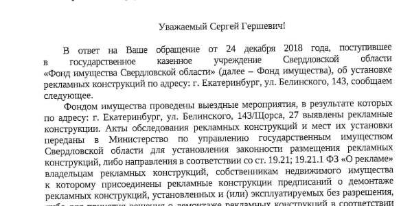 Номер жалобы:47512 Тип жалобы:Прочее Название объекта:Мугисо Регион:Свердловская область Город:г. Екатеринбург Адрес:ул. Белинского, 143 Описание жалобы:Рекламные щиты. Белинского 143, через дорогу от ТЦ Марс Статус: