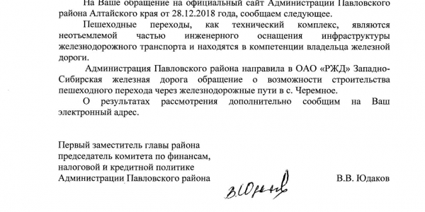 Номер жалобы:47516 Тип жалобы:Прочее Название объекта: Регион:Алтайский край Город:село Черемное Адрес:село Черемное Описание жалобы:В с.Черемное отсутствует пешеходный переход через Ж/Д пути.Из-за чего жители вынуждены переходить пути в неположенном месте. Статус: