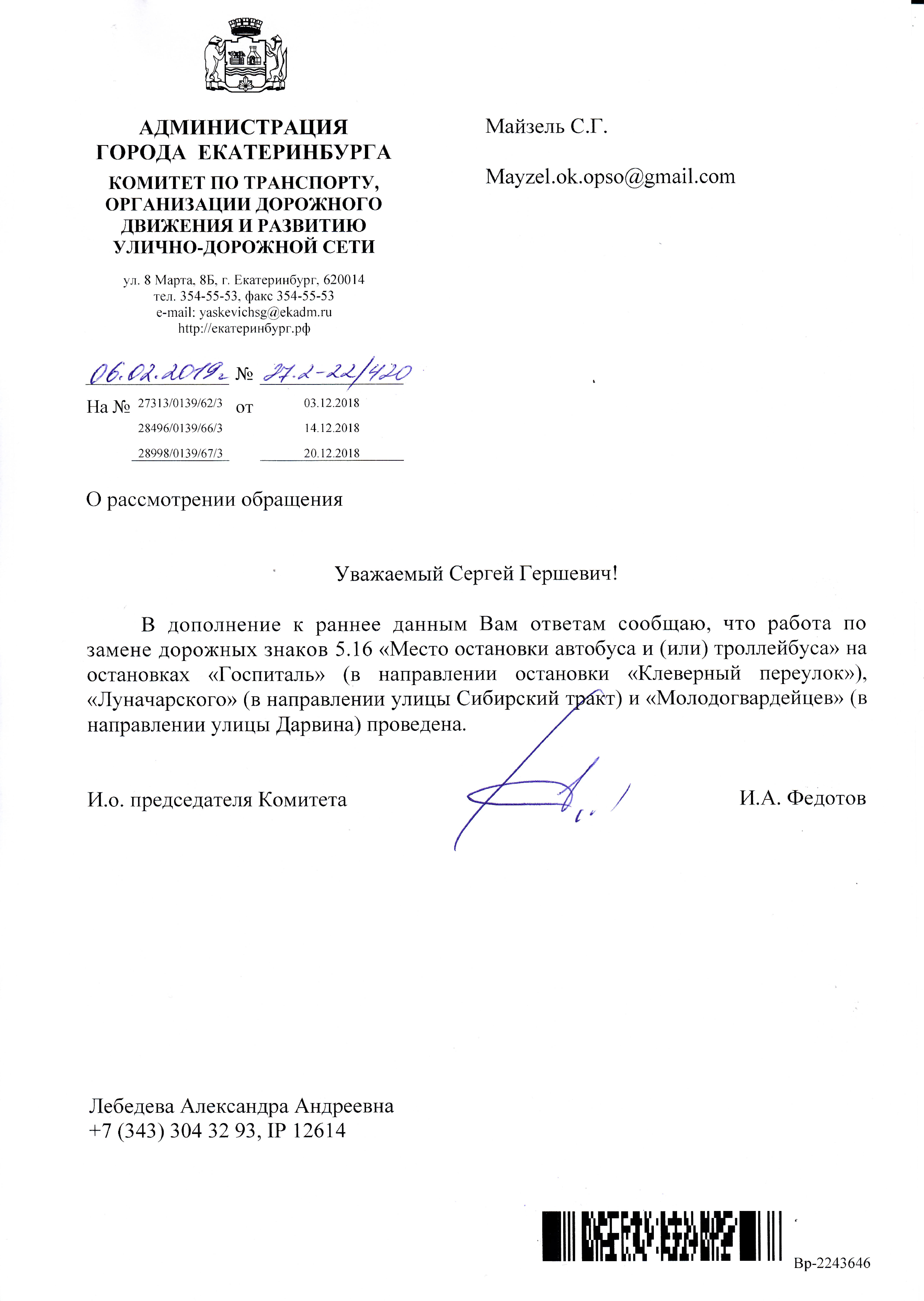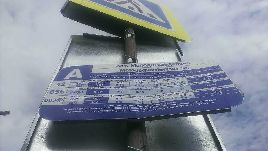 Номер жалобы:47408 Тип жалобы:Прочее Название объекта: Регион:Свердловская область Город:Екатеринбург Адрес:улица Молодогвардейцев, 1 Описание жалобы:Остановка Молодогвардейцев, в сторону ул. Дарвина. Не верный список маршрутов на знаке "Место остановки автобуса". Фактически проезжают маршруты: 42,056,083. Также список на знаке не совпадает со списком на расписании. Статус: