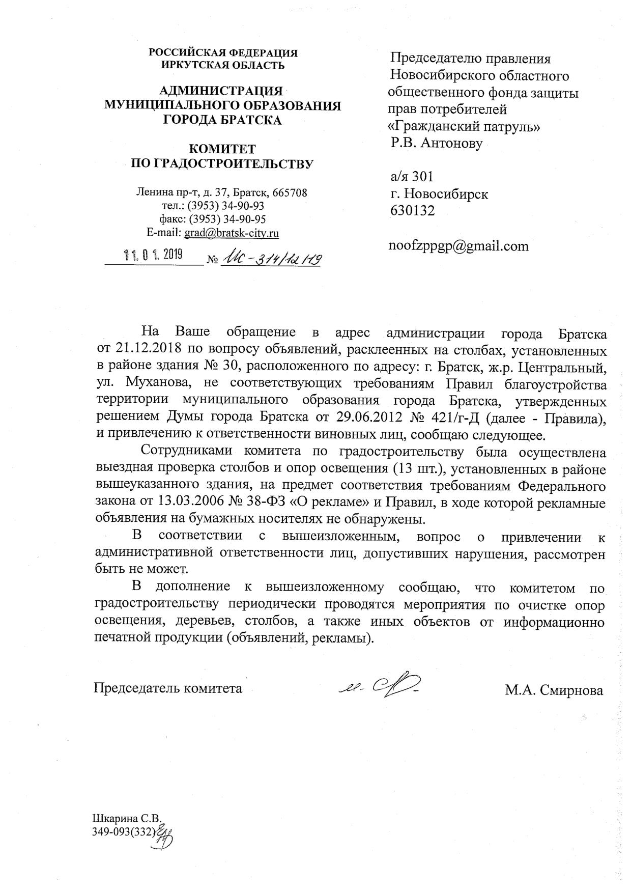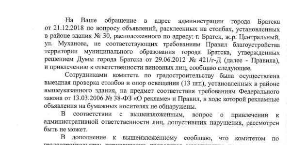 Номер жалобы:47387 Тип жалобы:Прочее Название объекта: Регион:Иркутская область Город:Братск Адрес:Братск, улица Муханова, 30 Описание жалобы:Загрязнение столбов освещения рекламой Статус: