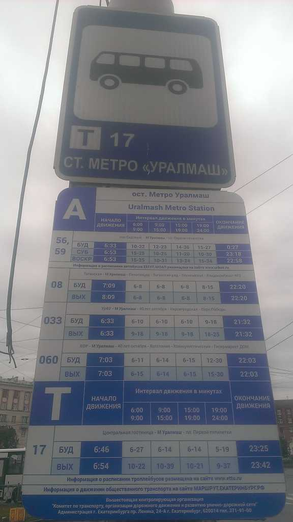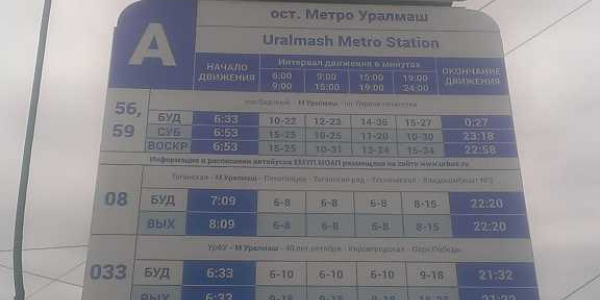 Номер жалобы:47405 Тип жалобы:Прочее Название объекта: Регион:Свердловская область Город:Екатеринбург Адрес:Екатеринбург, проспект Космонавтов, 23А Описание жалобы:Не правильный список маршрутов на знаке " Место остановки автобуса " на остановке м.Уралмаш в сторону площади 1-й Пятилетки. Фактически приезжают маршруты: А56,56Б,59,08,033,060, Т17. Статус: