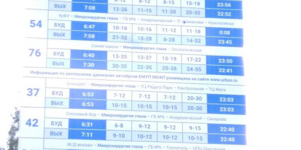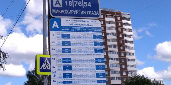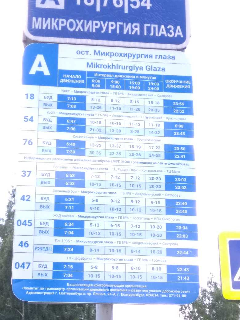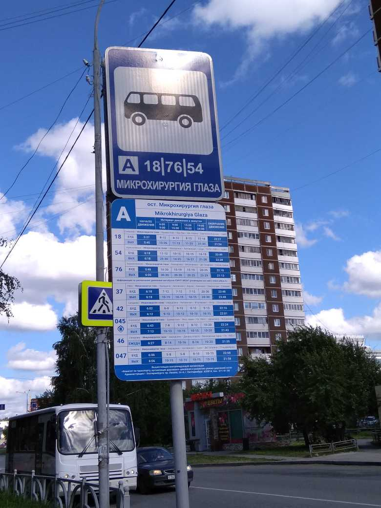 Номер жалобы:47406 Тип жалобы:Прочее Название объекта: Регион:Свердловская область Город:Екатеринбург Адрес:Екатеринбург, улица Академика Бардина Описание жалобы:Остановка Микрохирургия глаза в сторону ул.С.Дерябиной. Не правильный список маршрутов на знаке "Место остановки автобуса", он противоречит списку на расписании. Также на расписании список не полный. Фактически проезжают маршруты: 18,37,42,46,54,76,05,045,047 Статус: