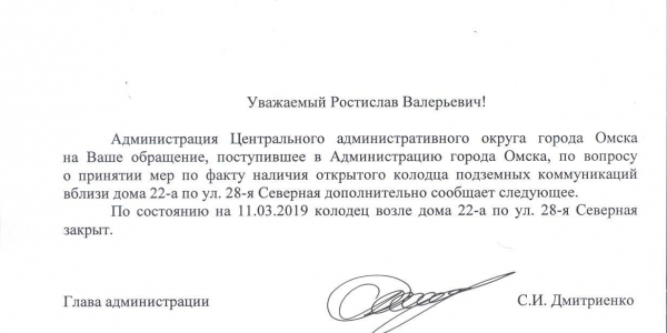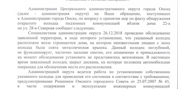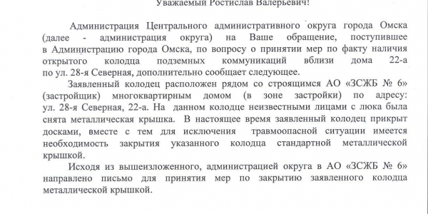 Номер жалобы:47413 Тип жалобы:Прочее Название объекта: Регион:Омская область Город:Омск Адрес:28-я Северная улица, 22А Описание жалобы:Открыт колодец Статус: