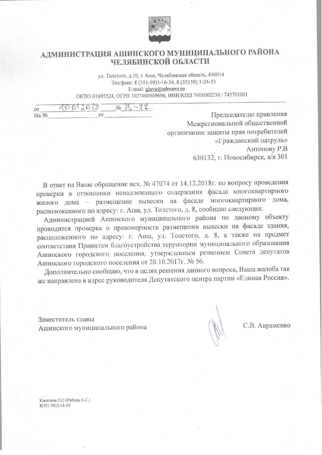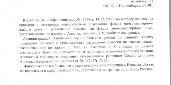 Номер жалобы:47074 Тип жалобы:Прочее Название объекта: Регион:Челябинская область Город:Аша Адрес:улица Толстого, 8 Описание жалобы:Незаконная вывеска на торце здания толстого, 8, а также каркас выше, портящий облик здания, необходимо все демонтировать. Статус: