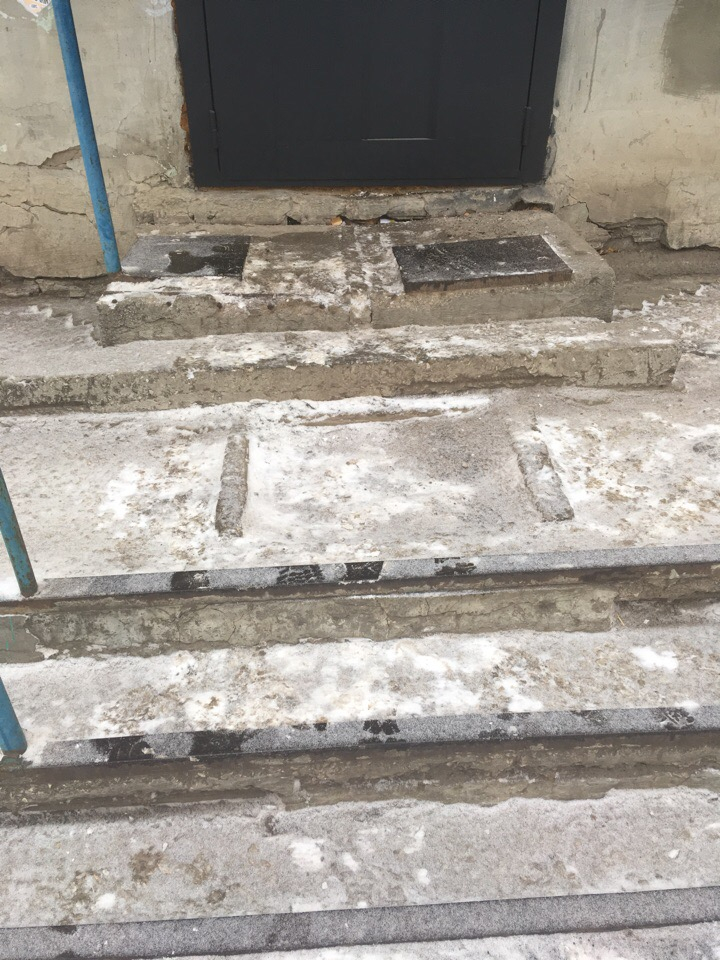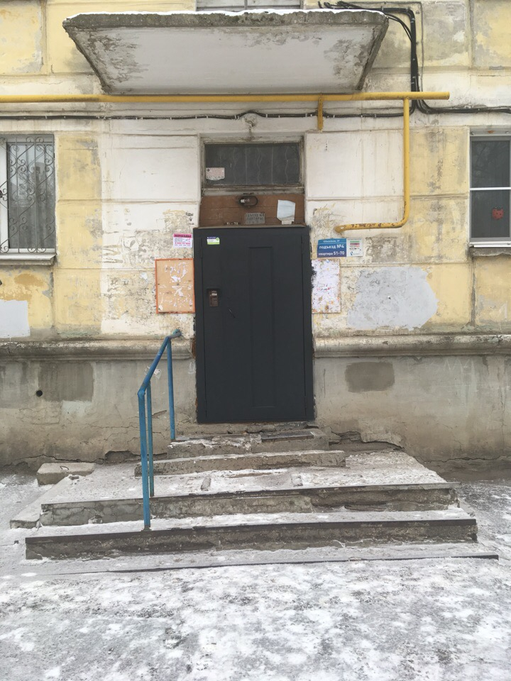 хочу пожаловаться на наше жуткое крыльцо, с которого уже не один человек упал, а с коляской просто невозможно съехать. Зимой металлическая пластина перед подъездной дверью леденеет и становится очень скользкой, ступени все корявые, жуткие, в первом подъезде какие-то работы проводились, а в четвертом как лет 15 точно ничего не делают с крыльцом.