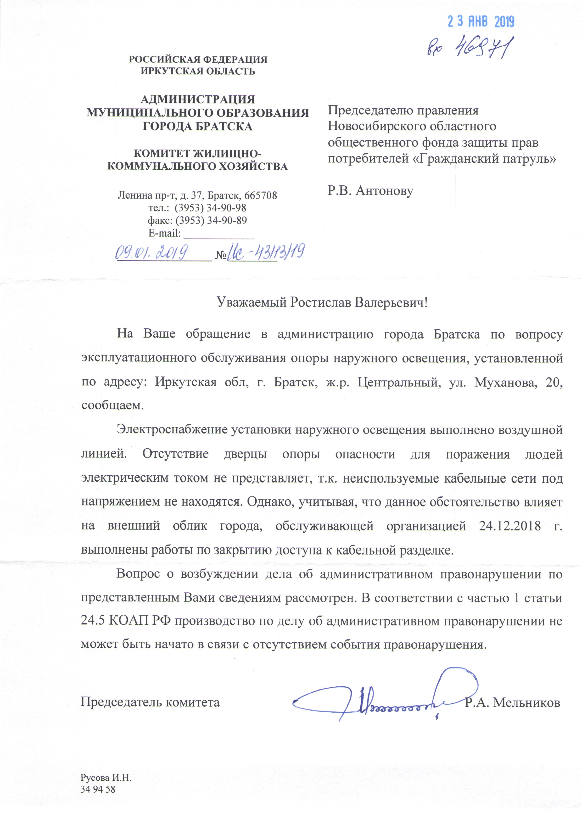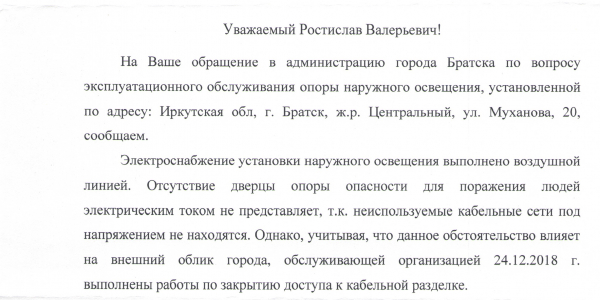 Номер жалобы:46971 Тип жалобы:Прочее Название объекта: Регион:Иркутская область Город:Братск Адрес:Братск, улица Муханова, 20 Описание жалобы:Оголенные провода в основании столба освещения Статус: