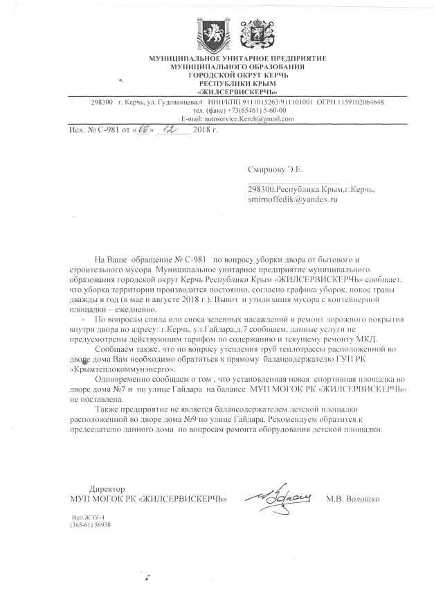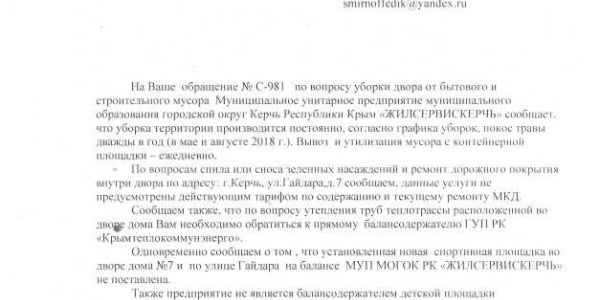 Номер жалобы:47027 Тип жалобы:Прочее Название объекта:, МУП МОГОК "ЖИЛКОМСЕРВИС КЕРЧЬ", Администрация Керчи Адрес:(45.36377845657033, 36.47144068032503) Описание жалобы:47031 Керчь гайдара 7, не спиливаются сухие деревья во дворе, не ремонтируются дороги во дворе, не ремонтируется детская площадка. Статус: