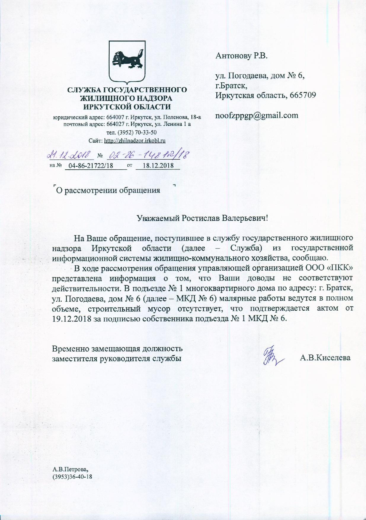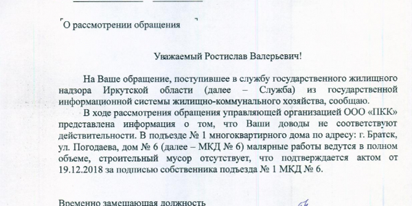 Номер жалобы:47060 Тип жалобы:Прочее Название объекта: Регион:Иркутская область Город:Братск Адрес:Братск, улица Погодаева, 6 Описание жалобы:Ремонт остановился в подъезде,не понятно по какой причине, неделю никто не приходит уже,а побелку и шпаклевку ни разу не убирали , чистым в квартиру тяжело дойти. Статус: