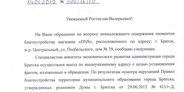 Номер жалобы:47039 Тип жалобы:Прочее Название объекта: Регион:Иркутская область Город:Братск Адрес:Братск, улица Подбельского, 39 Описание жалобы:Очень скользкое крыльцо магазина днс вне ковра. Представляет опасность для жизни и здоровья посетителей и прохожих. Не имеет ограждения, предотвращающего попадание человека на опасную скользкую поверхность Статус: