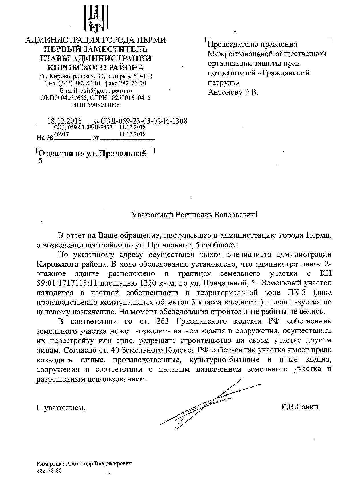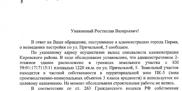 Номер жалобы:46917 Тип жалобы:Прочее Название объекта: Регион:Пермский край Город:Пермь Адрес:Пермь, Причальная улица, 5 Описание жалобы: проверить на законность построики. Бывший завод ЖБИ зоозащитники забрали под обустройство "мини-приюта". Проверить является ли он собственностью Семена Филлиповского по дукументам. Статус: