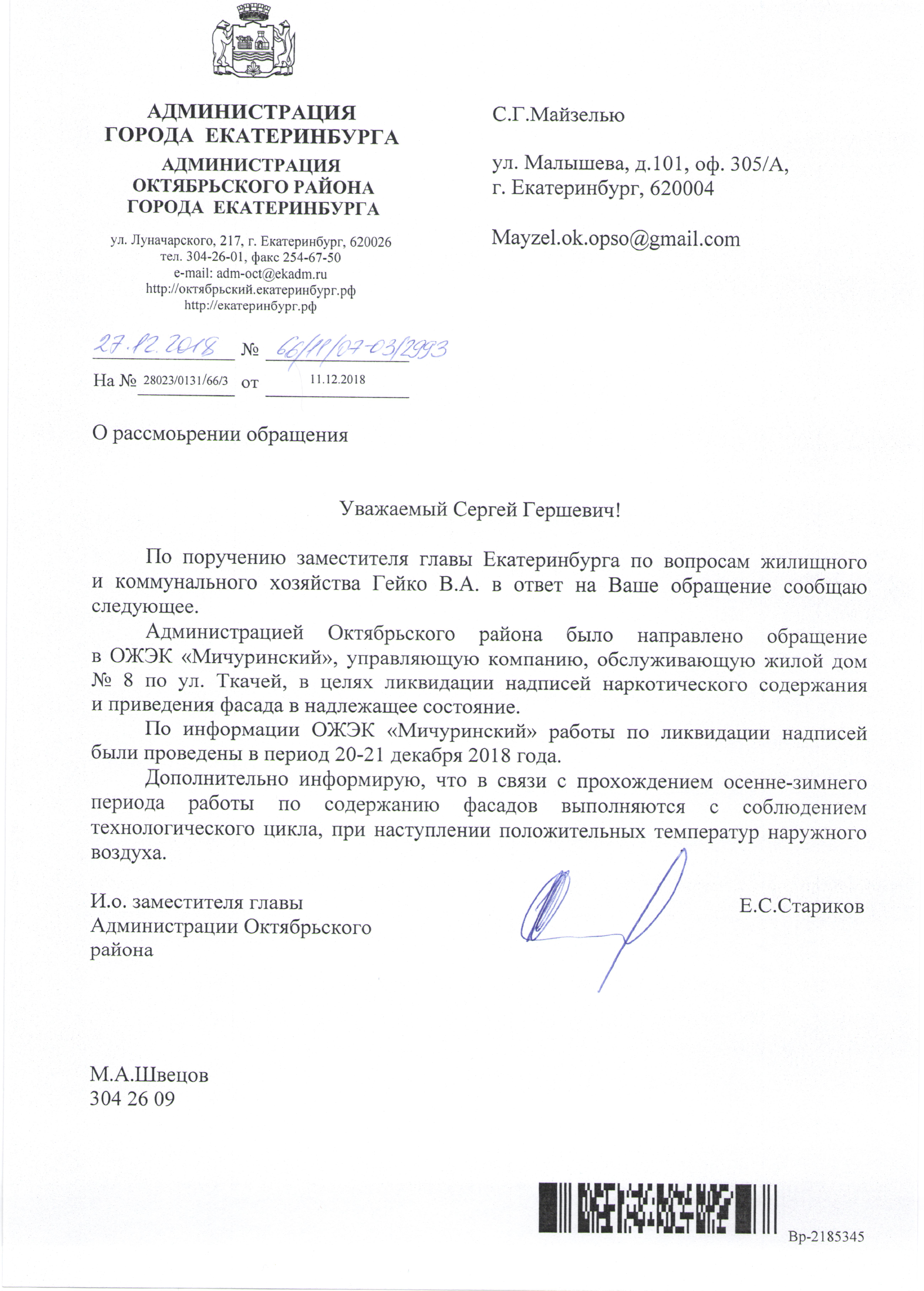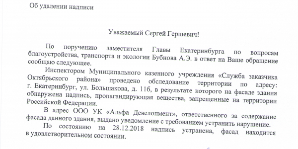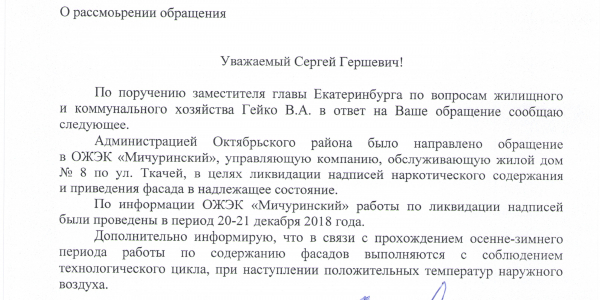 Номер жалобы:46935 Тип жалобы:Прочее Название объекта: Регион:Свердловская область Город:Екатеринбург Адрес:Екатеринбург, улица Ткачей, 8 Описание жалобы:Реклама наркотиков закрашена некачественно - текст виден Статус: