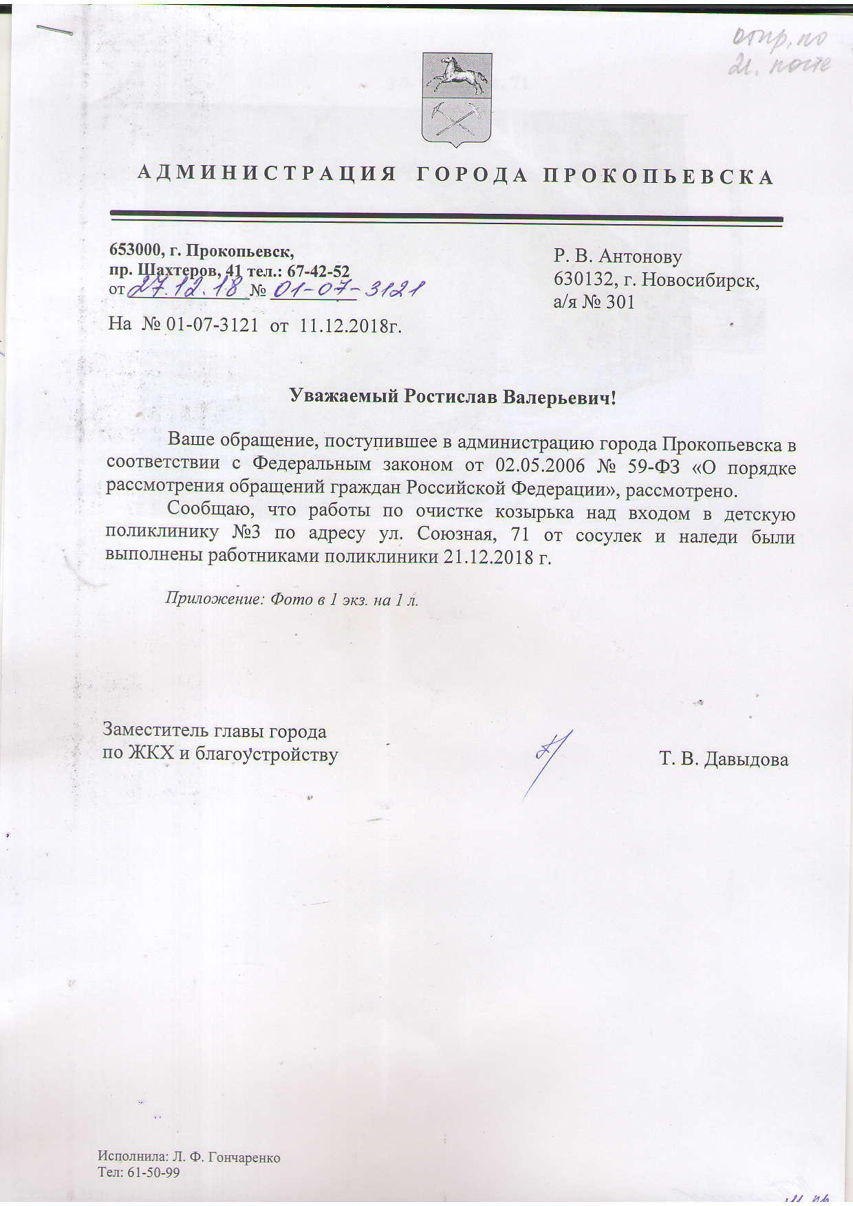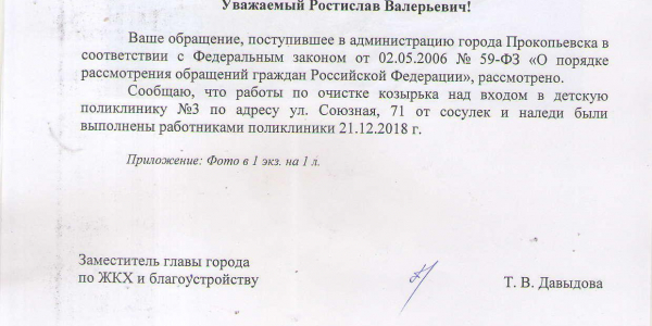 Номер жалобы:46858 Тип жалобы:Прочее Название объекта: Регион:Кемеровская область Город:Прокопьевск Адрес:Прокопьевск, Союзная улица, 71 Описание жалобы:Сосульки над пандусом в поликлинику Статус: