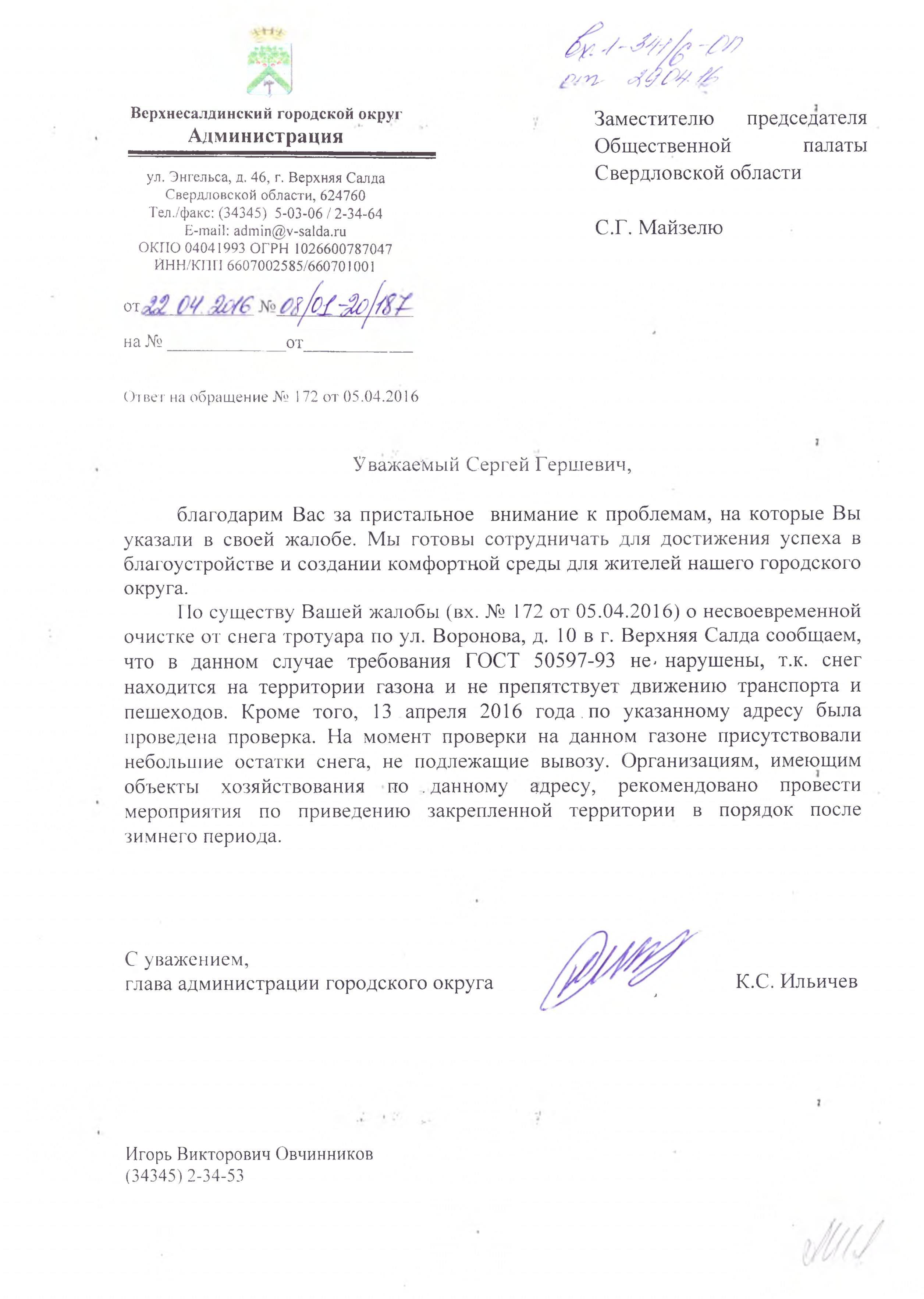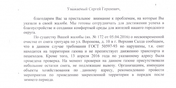 Номер жалобы:3465 Тип жалобы:Качество уборки снега на тротуарах Название объекта:Администрация г. Верхняя Салда Регион:Свердловская область Город:Верхняя Салда Адрес:ул. Воронова, 10 Описание жалобы:Не вывозится снег с газона по адресу ул Воронова д. 10 Статус: