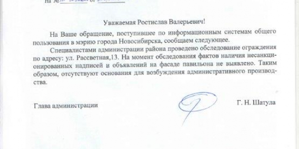 Номер жалобы:43347 Тип жалобы:Иные проблемы ЖКХ Название объекта:Управляющая Компания Город:Новосибирск Адрес:Новосибирск, 13 Рассветная улица Описание жалобы:Рисунки Статус: