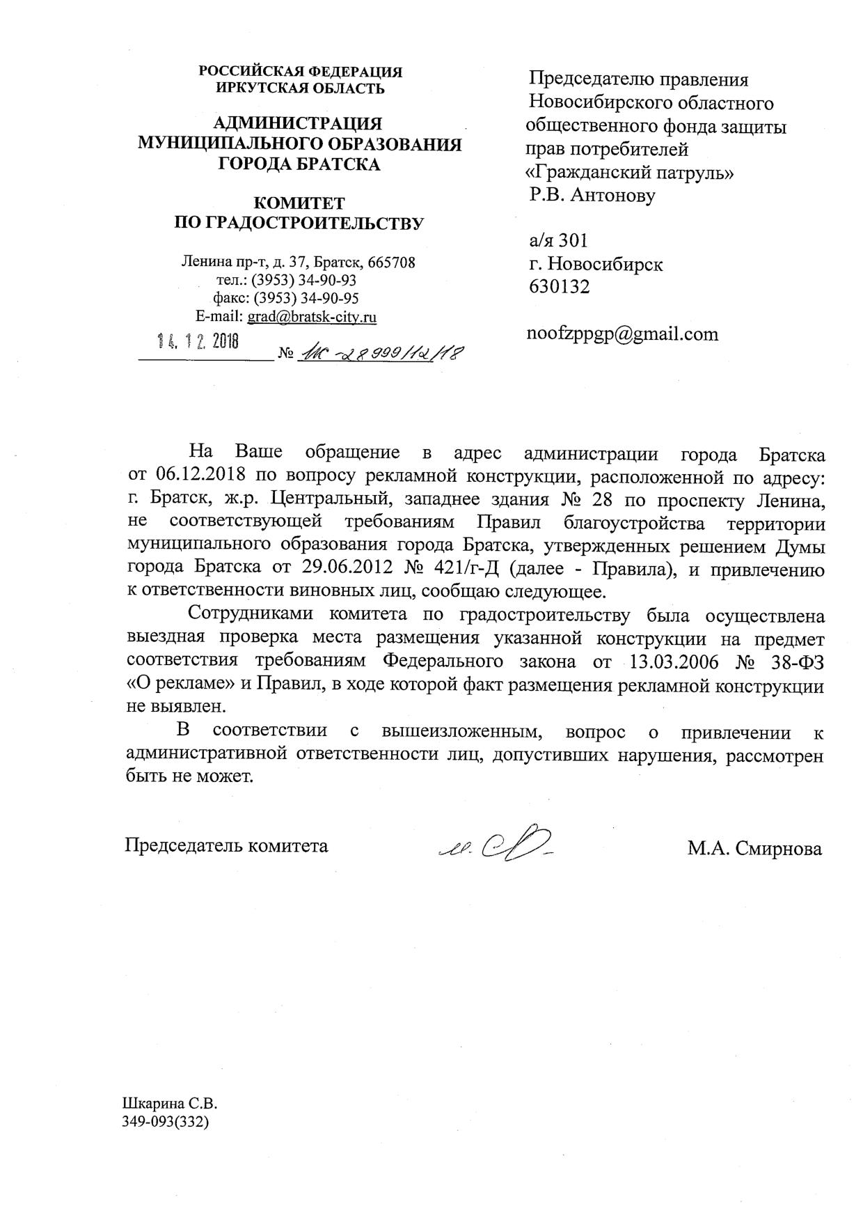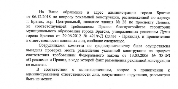 Номер жалобы:46683 Тип жалобы:Прочее Название объекта: Регион:Иркутская область Город:Братск Адрес:Братск, проспект Ленина, 28 Описание жалобы:Размещение рекламы в неположенном месте Статус: