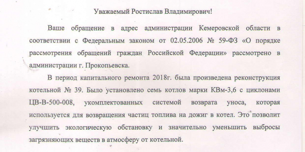 Котельная 39. Из трубы котельной сыпется сажа, засыпая двор и детскую площадку. Писали жалобу главе области. Котельную оштрафовали и обязали устранить наршение.В предыдущей жалобе прищел ответ от 33, а необходимо 39. Статус: