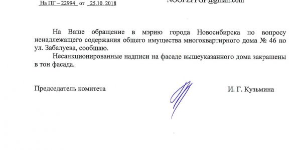 Номер жалобы:43118 Тип жалобы:Иные проблемы ЖКХ Название объекта:Управляющая Компания Город:Новосибирск Адрес:Новосибирск, 46 улица Забалуева Описание жалобы:разрисован фасад здания Статус: