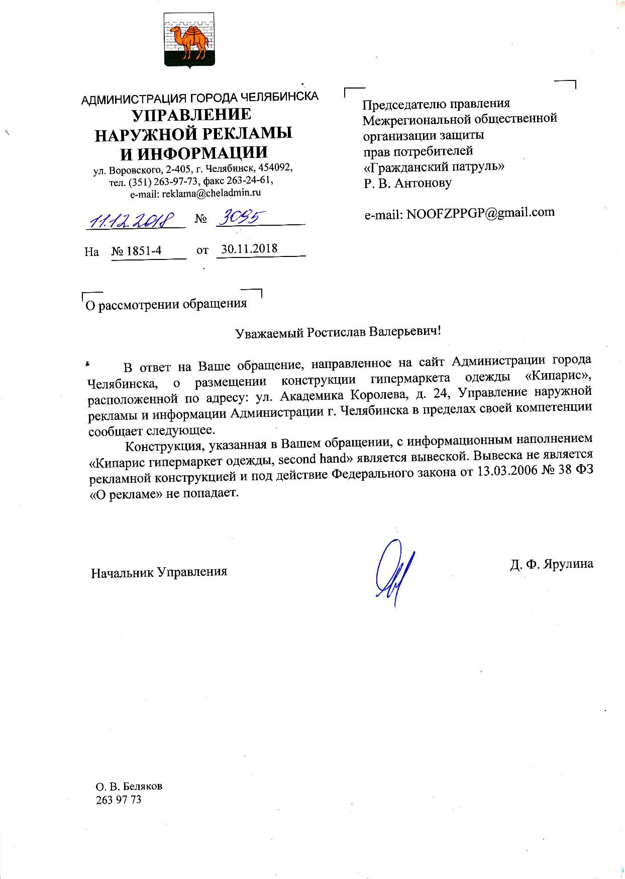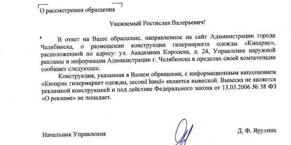 Номер жалобы:46394 Тип жалобы:Прочее Название объекта:Администрация Центрального района г.Челябинска Регион:Челябинская область Город:Челябинск Адрес:улица Академика Королёва, 24 Описание жалобы:Незаконная реклама на фасаде здания. Баннерная ткань.