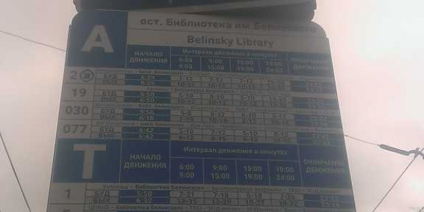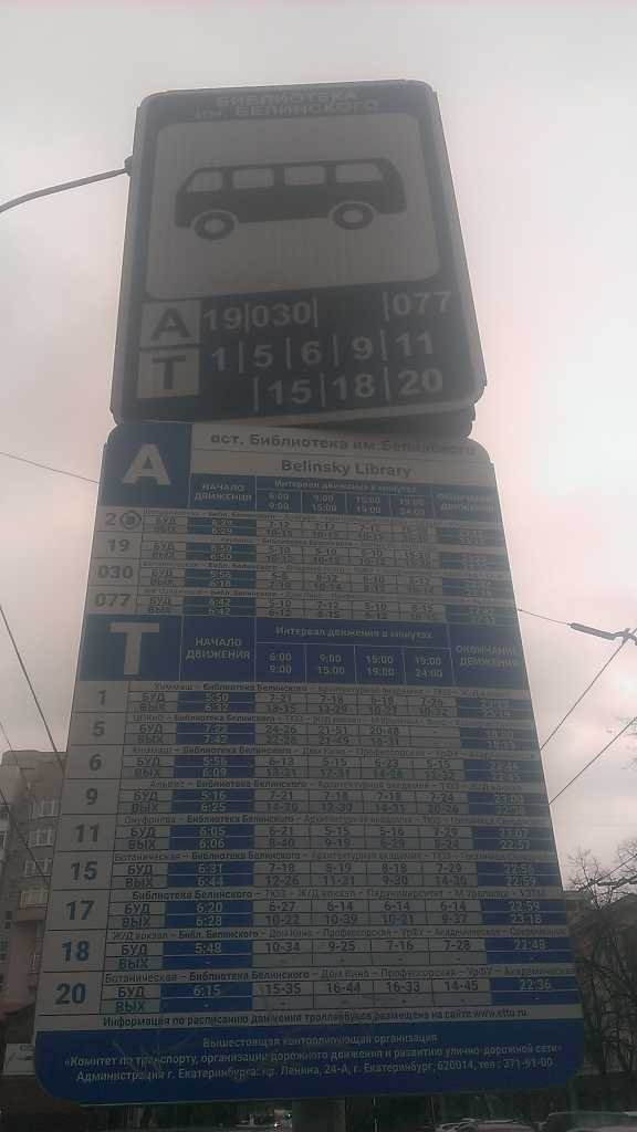Номер жалобы:46403 Тип жалобы:Прочее Название объекта: Регион:Свердловская область Город:Екатеринбург Адрес:Екатеринбург, улица Белинского, 11А Описание жалобы:Остановка Белинского (в сторону ул. Малышева). Не верный список маршрутов на знаке " Место остановки автобуса". Фактически проезжают маршруты: 1,2,19,030,056,077 Статус: