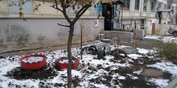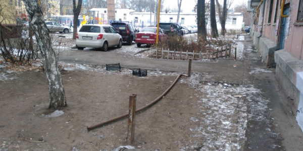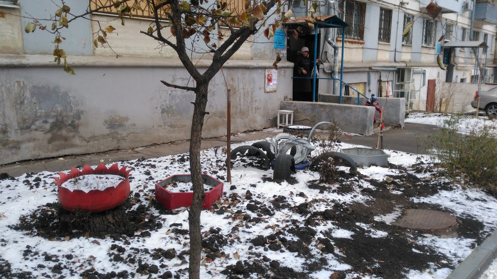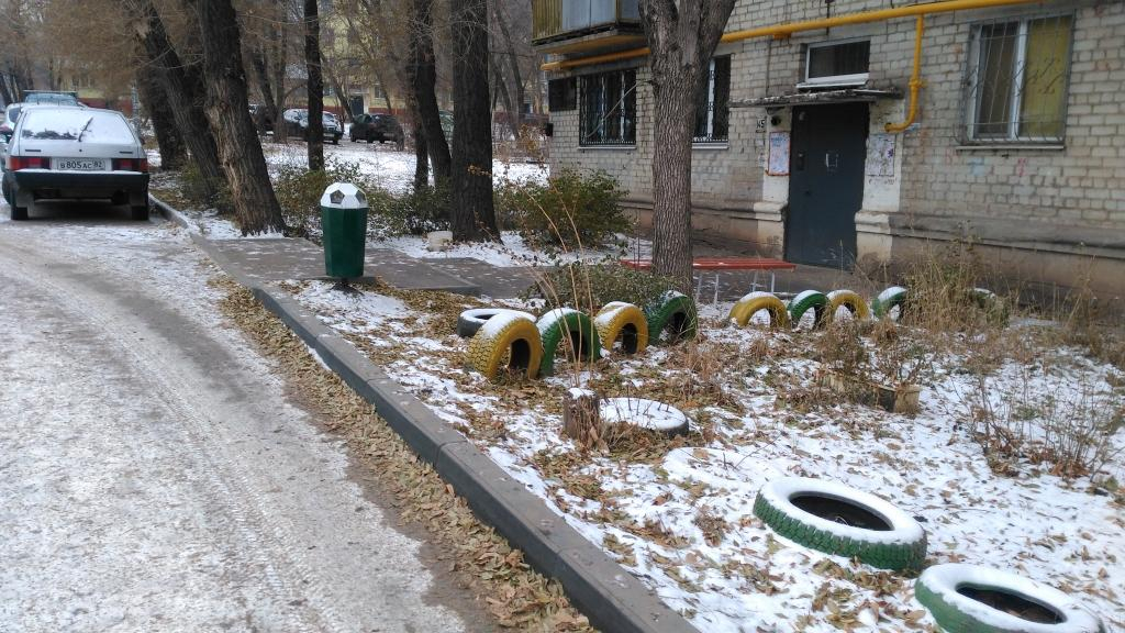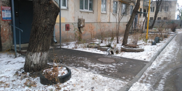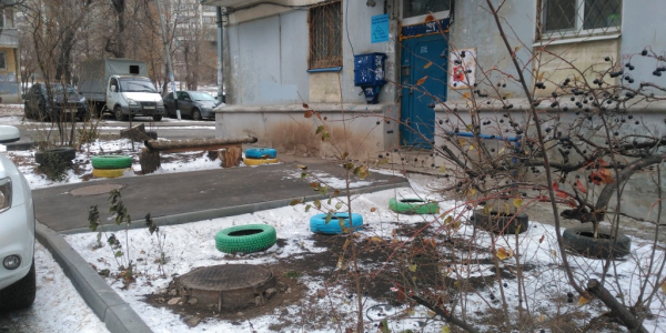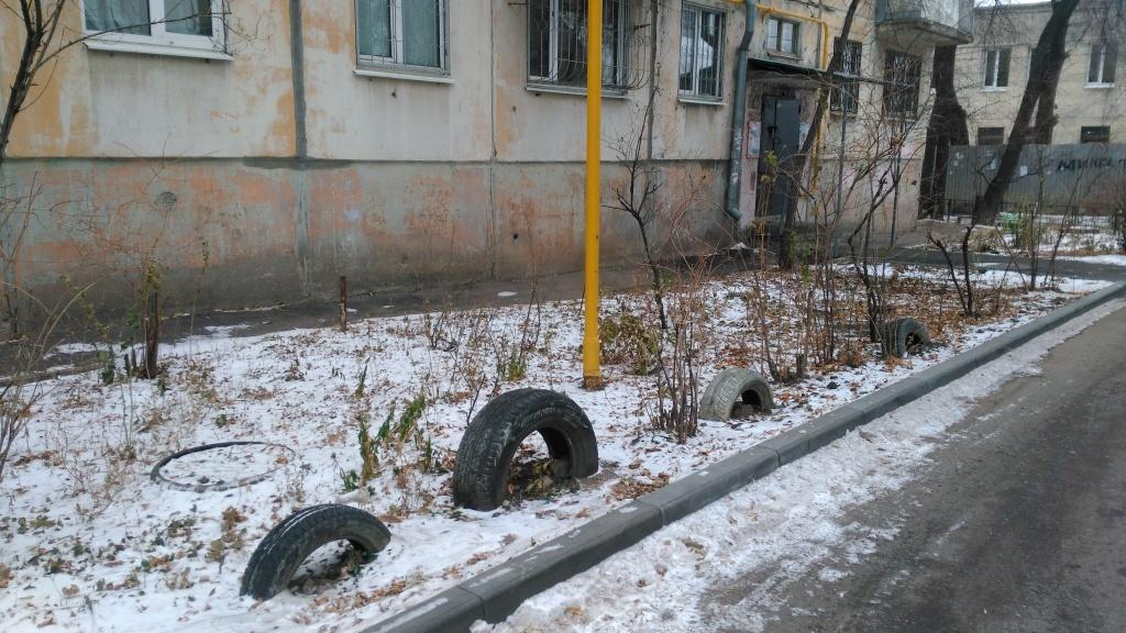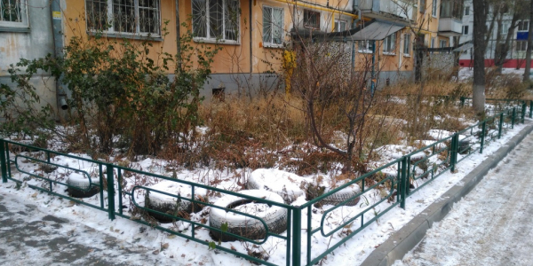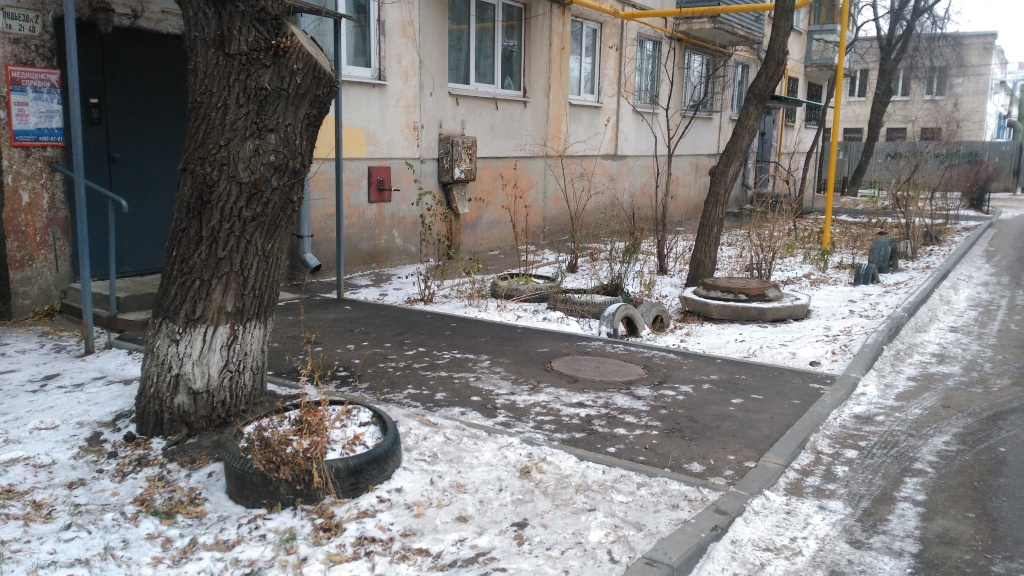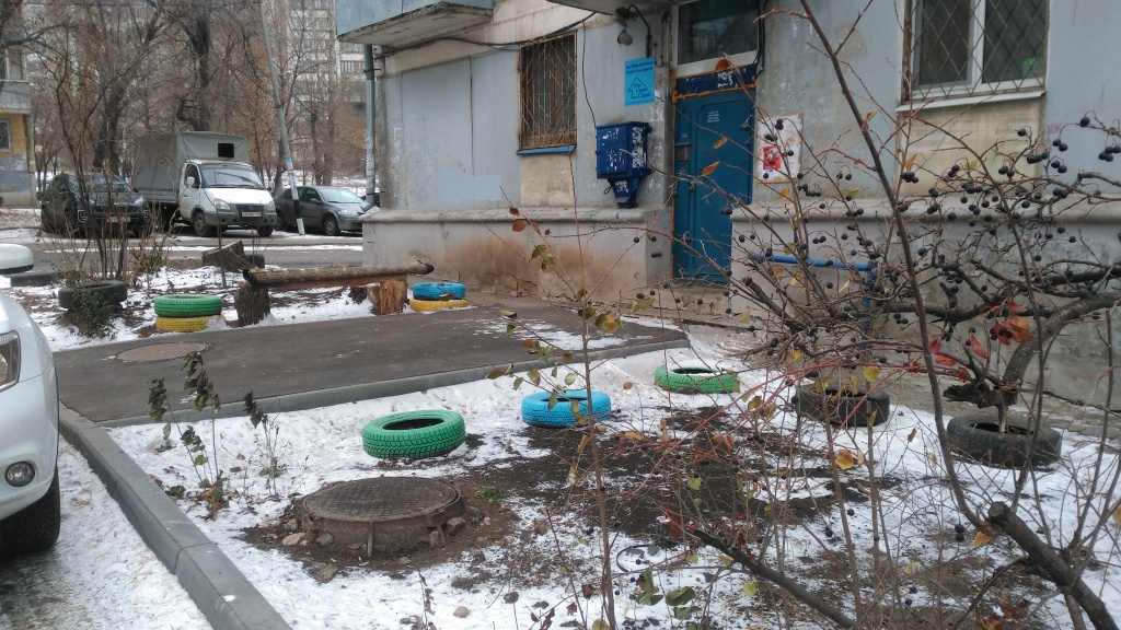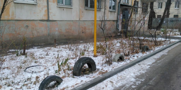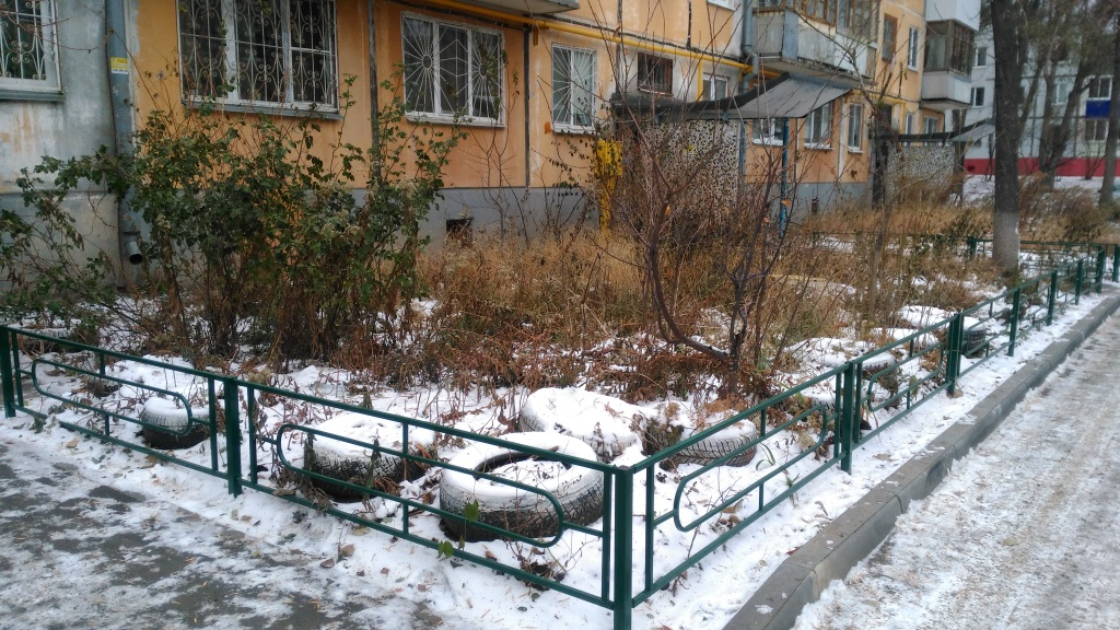 Во многом дворы остались неблагоустроенными - по прежнему можно наблюдать бурьян, пни, ржавые стальные конструкции и автомобильные шины в качестве клумб.