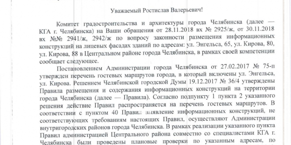 Номер жалобы:46396 Тип жалобы:Прочее Название объекта:Администрация Центрального района г.Челябинска Регион:Челябинская область Город:Челябинск Адрес:улица Кирова, 80 Описание жалобы:Незаконная реклама на фасаде здания. Баннерная ткань. г.Челябинск, ул. Кирова, 80 Статус: