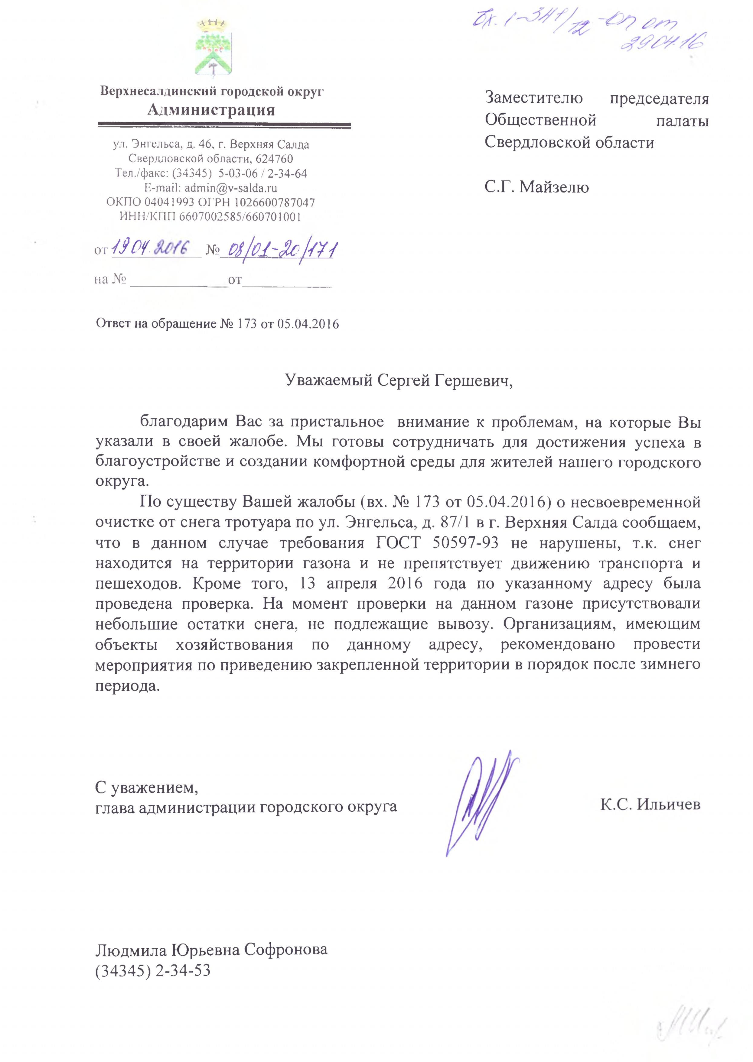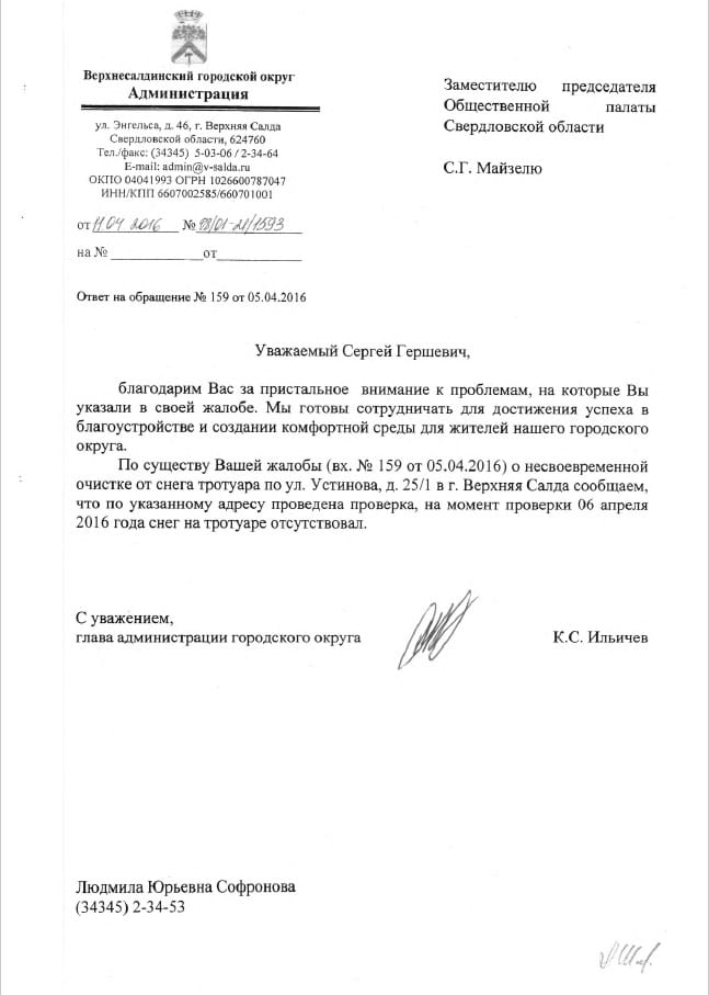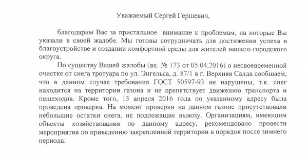 Номер жалобы:3461 Тип жалобы:Качество уборки снега на тротуарах Название объекта:Администрация г. Верхняя Салда Регион:Свердловская область Город:Верхняя Салда Адрес:ул. Энгельса, 87/1 Описание жалобы:Не вывозится снег, складируется на газоне Статус: