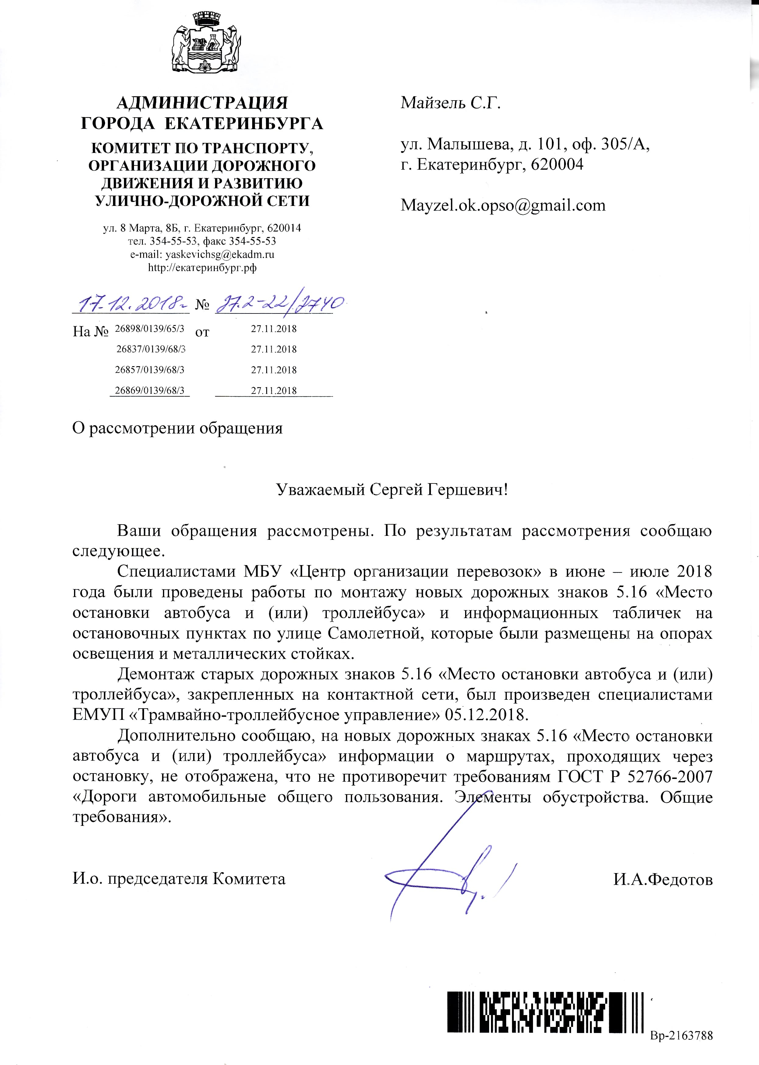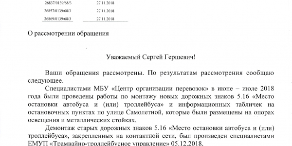 Номер жалобы:46051 Тип жалобы:Прочее Название объекта:Не Знаю Регион:Свердловская область Город:Екатеринбург Адрес:ул. Самолётная,45 Описание жалобы:На знаке остановочного комплекса, как и на самом комплексе Карцевая в сторону ул. Павлодарской (ул. Самолётная,45) список проходящих маршрутов общественного транспорта не совпадает с реальным. На знаке указан маршрут троллейбуса #9, на комплексе - Троллейбус #9 и Автобус 37. По факту останавливаются следующие - Автобус 37, 012, 042, троллейбус 9 Статус: