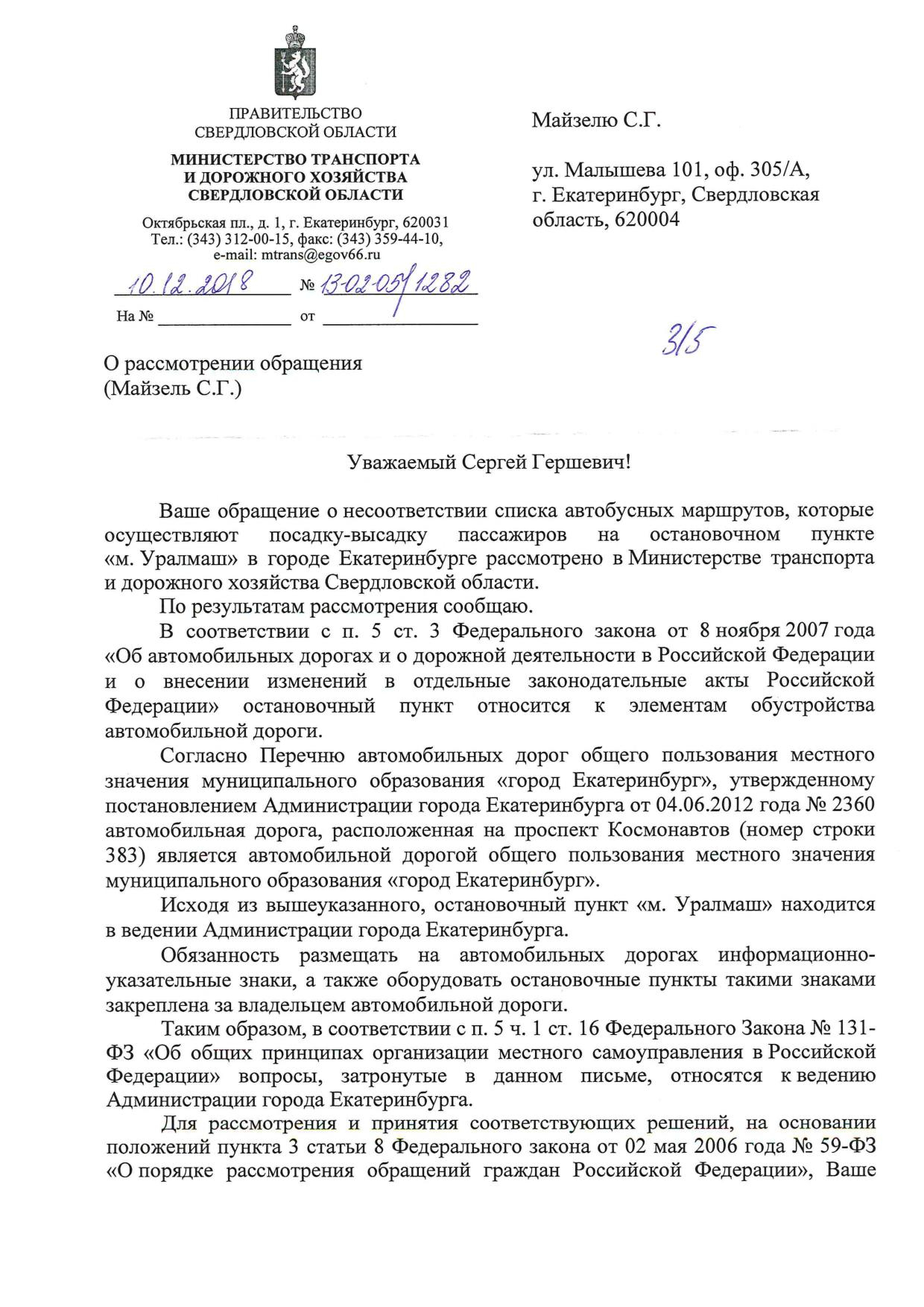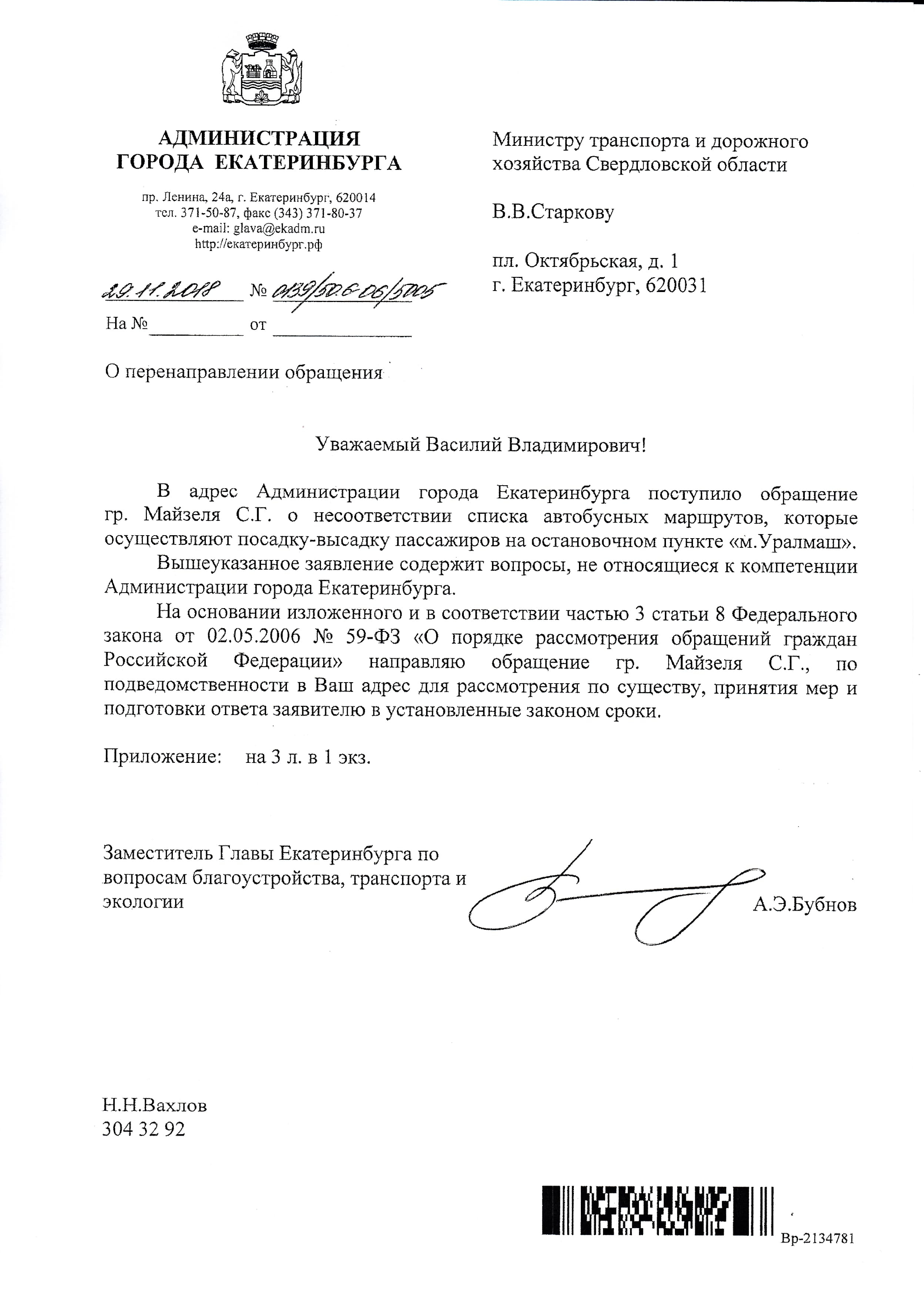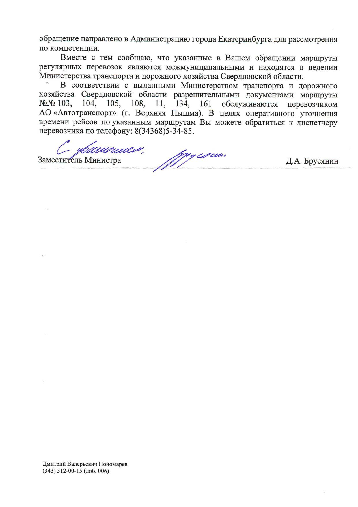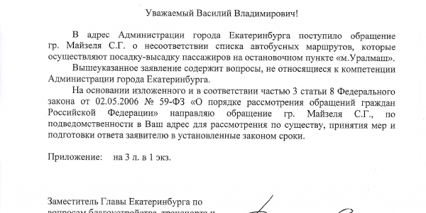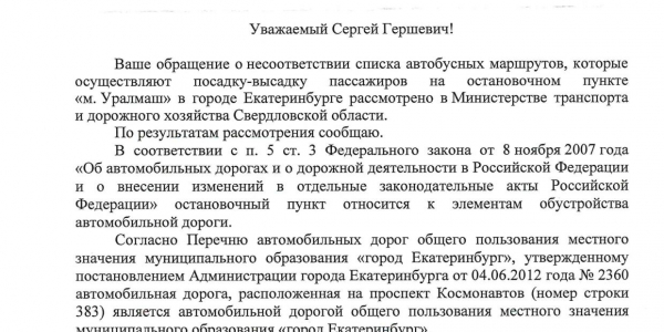 Номер жалобы:46069 Тип жалобы:Прочее Название объекта:Не Знаю. Регион:Свердловская область Город:Екатеринбург Адрес:пр Космонавтов, 101/2 Описание жалобы:Список маршрутов на навеса комплекса м.Уралмаш (пр-кт Космонавтов, 101/2) в сторону ул. Фронтовых бригад не совпадает с фактически остана сливающиеся ОТ (маршруты указанные на навеса: А 56, 108, 111. Маршруты фактические: А 103, 104, 105, 108, 111, 134, 161) Статус: