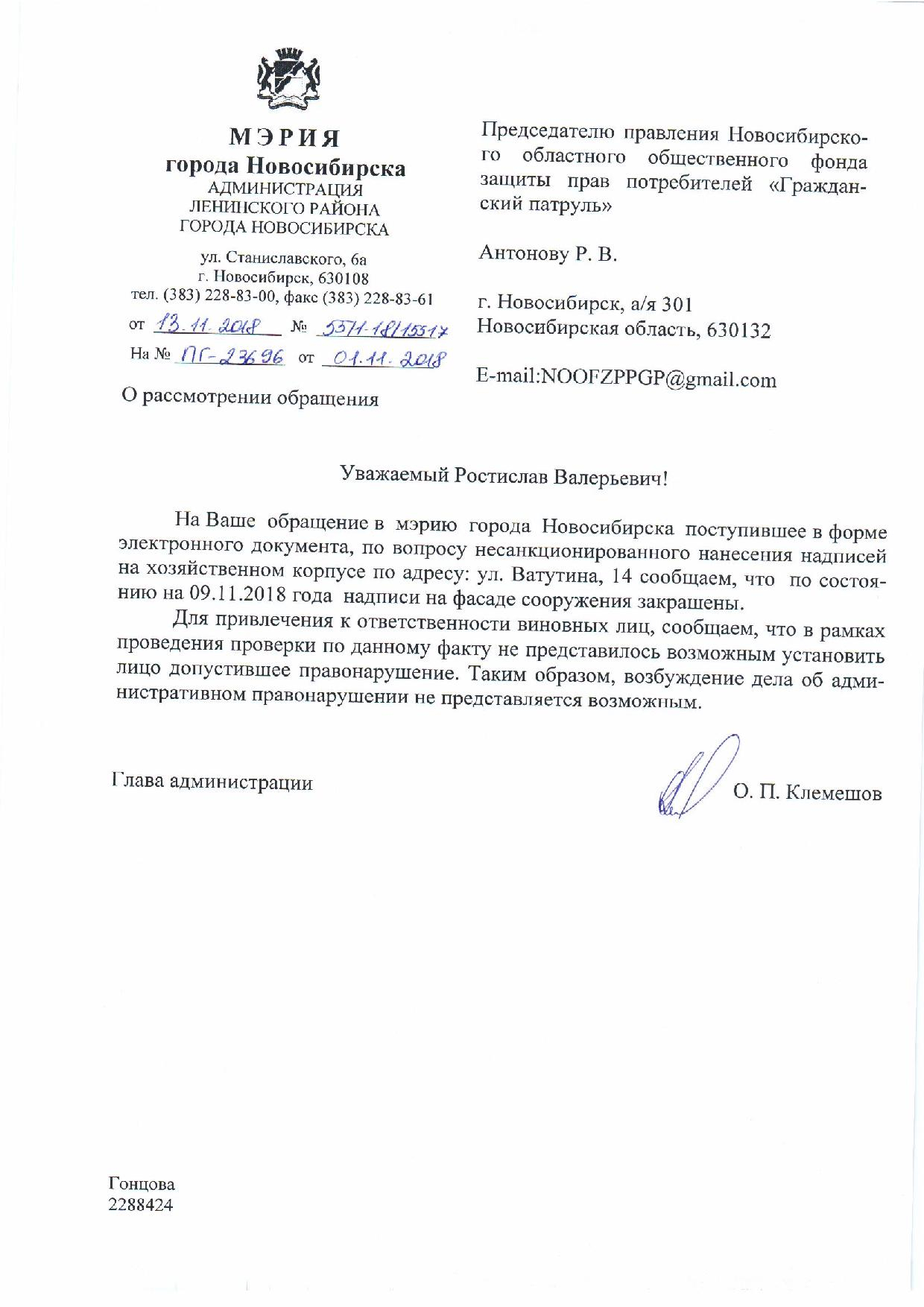 Номер жалобы:42237 Тип жалобы:Иные проблемы ЖКХ Название объекта:Управляющая Компания Регион:Новосибирская область Город:Новосибирск Адрес:ул. Ватутина, 14 Описание жалобы:Надписи на хозяйственном корпусе Статус: