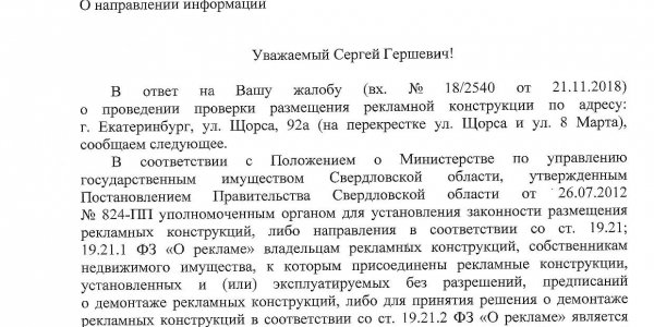 Номер жалобы:45946 Тип жалобы:Прочее Название объекта:Мугисо Регион:Свердловская область Город:Екатеринбург Адрес:улица Щорса, 92а Описание жалобы:Рекламный щит , перексток Щорса 8 марта, угол у здания Автовокзала Статус: