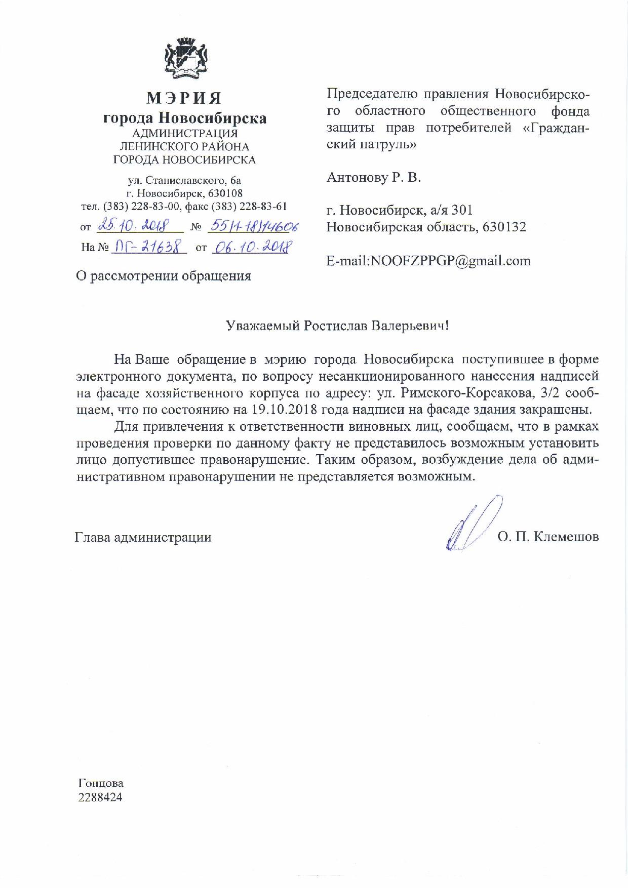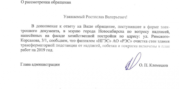 Номер жалобы:42216 Тип жалобы:Иные проблемы ЖКХ Название объекта:Управляющая Компания Регион:Новосибирская область Город:Новосибирск Адрес:ул. Римского-Корсакова, 3/1 Описание жалобы:Надписи на фасаде хозяйственного корпуса Статус:
