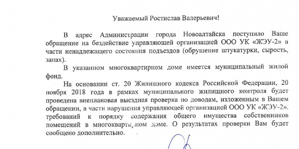 Номер жалобы:41822 Тип жалобы:Иные проблемы ЖКХ Название объекта: Регион:Алтайский край Город:Новоалтайск Адрес:Парковая 5 Описание жалобы:По адресу Парковая 5, второй подъезд, уже долгое время такая ситуация. Здесь живёт моя бабушка, ей скоро 90. Я не знаю откуда идёт эта сырость. Вся штукатурка отваливается, в некоторых местах уже до кирпича. На фото это уже уборщица убрала мусор, а так там повсюду штукатурка. Сырость пахнет жутко. Прошу принять какие-то то меры, за ремонт же они платят. Статус: