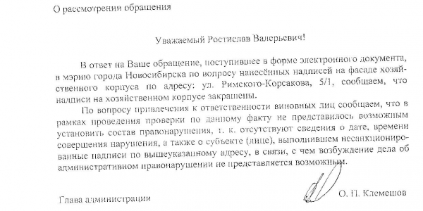 Номер жалобы:41882 Тип жалобы:Иные проблемы ЖКХ Название объекта:Управляющая Компания Регион:Новосибирская область Город:Новосибирск Адрес:ул. Римского-Корсакова, 5/1 Описание жалобы:Надписи на фасаде хоз корпуса Статус: