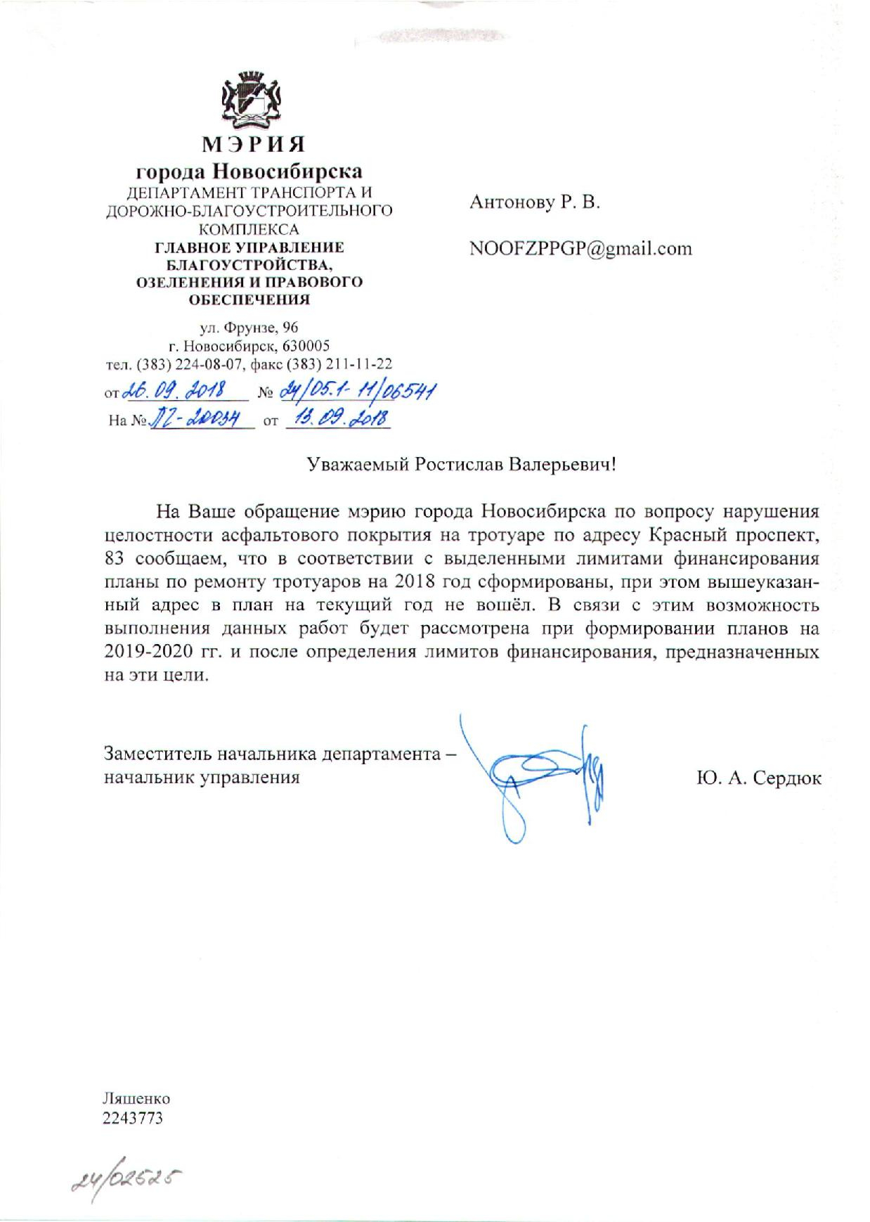 Номер жалобы:41119 Тип жалобы:Иные проблемы ЖКХ Название объекта:Управляющая Компания Регион:Новосибирская область Город:Новосибирск Адрес:Красный пр., 83 Описание жалобы:Яма на тротуаре перед домом Статус: