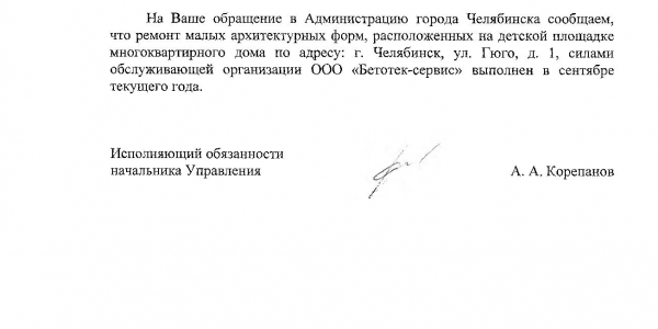 Номер жалобы:41108 Тип жалобы:Иные проблемы ЖКХ Название объекта:Администрация Ленинского Района Регион:Челябинская область Город:Челябинск Адрес:ул. Гюго, 1 Описание жалобы:933-18 Во дворе дома #1 по ул .Гюго на детской площадке вероятно сломанный снаряд, с торчащими штырями, небезопасный. Нужно или отремонтировать или демонтировать. Статус: