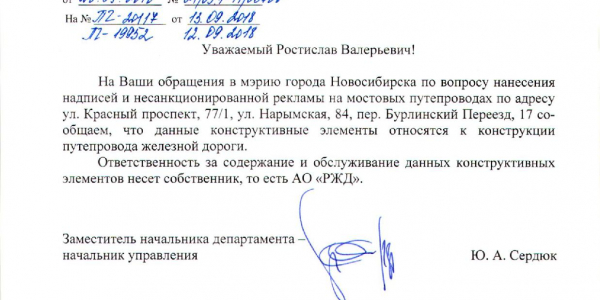 Номер жалобы:41118 Тип жалобы:Иные проблемы ЖКХ Название объекта:Управляющая Компания Регион:Новосибирская область Город:Новосибирск Адрес:Красный пр., 81 Описание жалобы:Надписи на фасаде дома Статус: