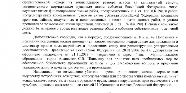 Номер жалобы:40665 Тип жалобы:Иные проблемы ЖКХ Название объекта: Регион:Свердловская область Город:Алапаевск Адрес:майоровская дом 8 А Описание жалобы:Скажите пожалуйста, как можно жить в таком доме, где падает штукатурка, падают стены, проваливается пол и никто за этим не следит, и никому ничего не нужно. Как жить людям? Дом в программу аварийного жилья не входит, сносить и расселять семьи никто не хочет. Видимо слишком затратно. Наверно начнут что-либо делать, когда совсем всё будет очень плохо или пострадают люди!? Статус:
