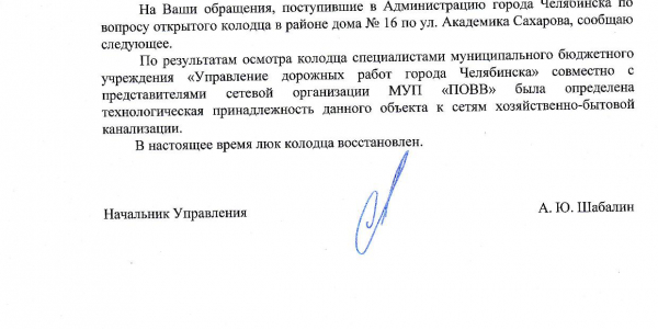Номер жалобы:45371 Тип жалобы:Прочее Название объекта:Не Известно Регион:Челябинская область Город:Челябинск Адрес:улица Академика Сахарова, 16 Описание жалобы:Открытый люк
