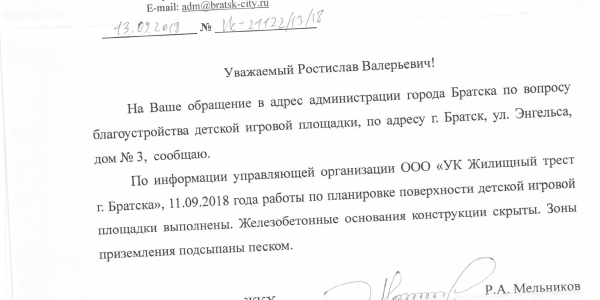 Номер жалобы:40466 Тип жалобы:Иные проблемы ЖКХ Название объекта:Площадка Регион:Иркутская область Город:Братск Адрес:ул. Энгельса, 3 Описание жалобы:По адресу: Иркутская область, г.Братск, ул. Энгельса, 3 на детской площадке открыты бетонные и железные основания конструкций что увеличивает травмоопасность. Статус:
