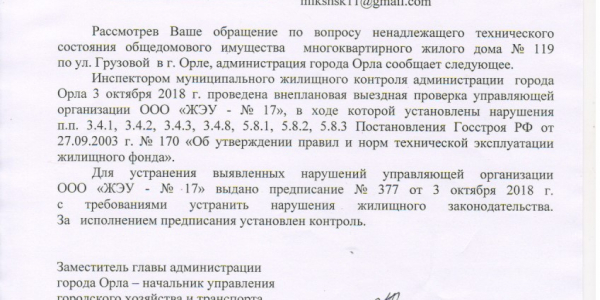 Номер жалобы:40473 Тип жалобы:Иные проблемы ЖКХ Название объекта:ЗАО ЖРЭУ 3, ПГУК, ЖЭУ 17 Регион:Орловская область Город:Орёл Адрес:ул. Грузовая, 119 Описание жалобы:Из подвала дома 119 постоянный очень сильный запах канализации. В квартирах на первом этаже скапливаются все эти испарения, сильный запах и в подъезде. Жить в постоянном запахе канализации не только некомфортно, но и небезопасно! Дверь в подвал постоянно открыта, любой желающий имеет доступ к нему. Скорее всего, превышен уровень метана, что является взрывоопасной ситуацией! Управляющие компании почему-то не могут решить проблему, которая длится не первый год. Замените сгнившие трубы в подвале! Статус: