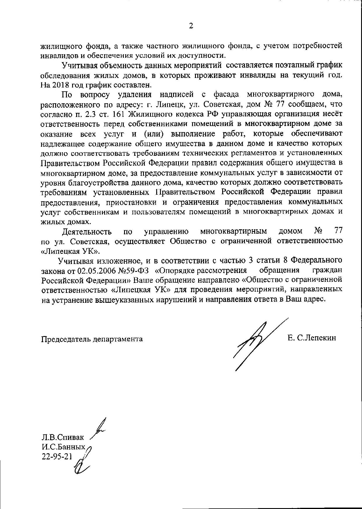 Номер жалобы:39609 Тип жалобы:Иные проблемы ЖКХ Название объекта:Ук Регион:Липецкая область Город:Липецк Адрес:ул. Советская, 77 Описание жалобы:Нет пандуса для инвалидов у подьездов, надписи на фасаде Статус: