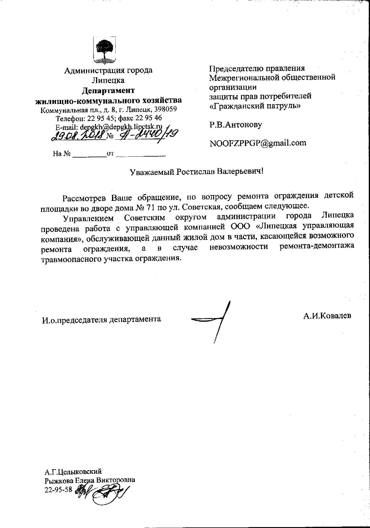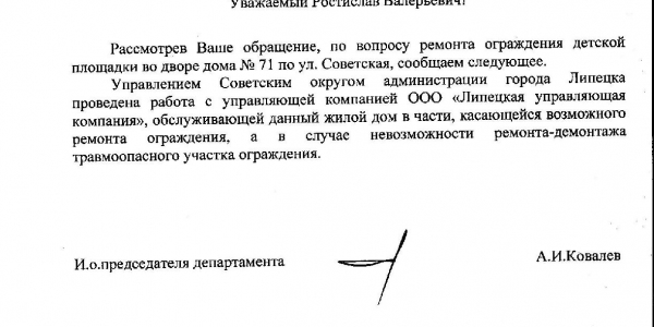 Номер жалобы:39607 Тип жалобы:Иные проблемы ЖКХ Название объекта:Ук Регион:Липецкая область Город:Липецк Адрес:ул. Советская, 71 Описание жалобы:Сломано ограждение. Острые штыри на детской площадке Статус: