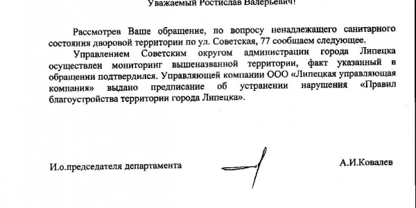 Номер жалобы:39610 Тип жалобы:Иные проблемы ЖКХ Название объекта:Ук Регион:Липецкая область Город:Липецк Адрес:ул. Советская, 77 Описание жалобы:Свалка Статус: