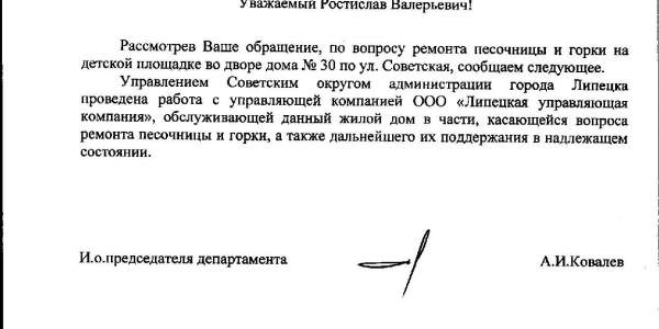 Номер жалобы:39590 Тип жалобы:Иные проблемы ЖКХ Название объекта:Ук Регион:Липецкая область Город:Липецк Адрес:ул. Советская, 30 Описание жалобы:Разрушена песочница и сломаны ступеньки на горке Статус: