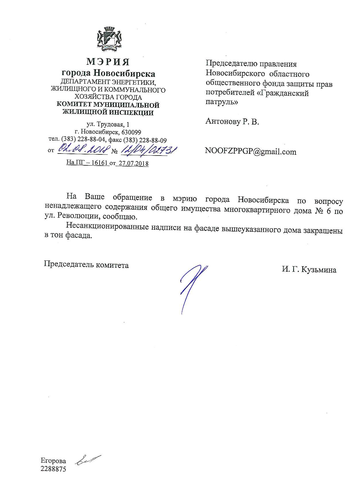 Номер жалобы:39344 Тип жалобы:Иные проблемы ЖКХ Название объекта:Ук Регион:Новосибирская область Город:Новосибирск Адрес:ул. Державина, 8 Описание жалобы:Надписи на фасаде Статус: