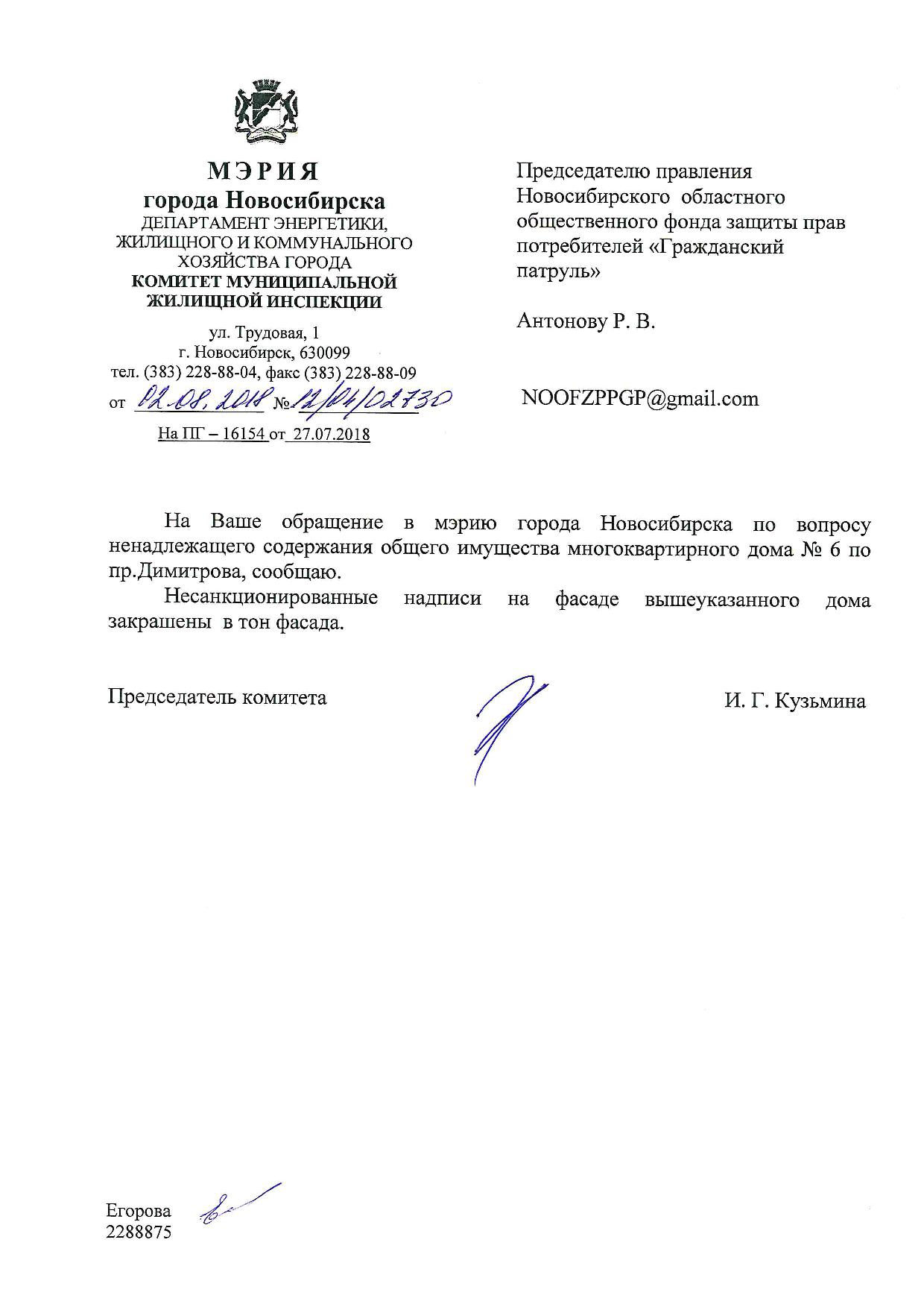 Номер жалобы:39243 Тип жалобы:Иные проблемы ЖКХ Название объекта:Управляющая Компания Регион:Новосибирская область Город:Новосибирск Адрес:пр. Димитрова, 6 Описание жалобы:Надписи на фасаде дома Статус: