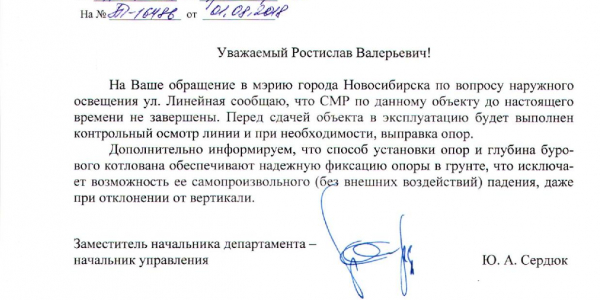 Номер жалобы:39399 Тип жалобы:Иные проблемы ЖКХ Название объекта:МКУ ГОРСВЕТ Регион:Новосибирская область Город:Новосибирск Адрес:ул. Линейная, 33 Описание жалобы:Вдоль улицы Линейная проходила установка столбов уличного освещения. Наблюдая за установкой столбов возникают вопросы к качеству проведённых работ, а именно к устойчивости конструкций. Некоторые столбы установлены не вертикально, качаются от порывов ветра. Так как вдоль улицы Линейная паркуются автомобили есть вероятность падения столбов на них. Прошу проверить данный факт и исправить некачественно выполненные работы. Статус: