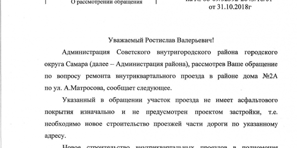 Номер жалобы:44645 Тип жалобы:Прочее Название объекта:? Регион:Самарская область Город:Самара Адрес:ул Александра Матросова, 2а/1 Описание жалобы:Проезд во дворе Статус: