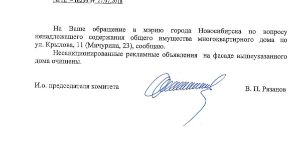 Номер жалобы:39215 Тип жалобы:Иные проблемы ЖКХ Название объекта:Управляющая Компания Регион:Новосибирская область Город:Новосибирск Адрес:ул. Крылова, 11/23 Описание жалобы:Мичурина 23, объявления в неположенном месте Статус: