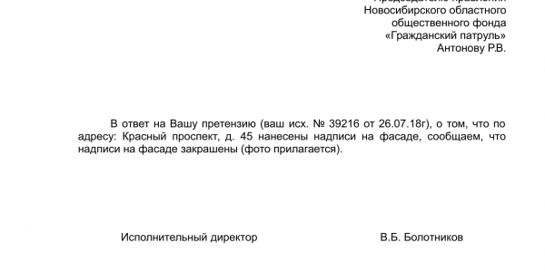 Номер жалобы:39216 Тип жалобы:Иные проблемы ЖКХ Название объекта:Управляющая Компания Регион:Новосибирская область Город:Новосибирск Адрес:Красный пр., 45 Описание жалобы:Надписи на фасаде дома Статус: